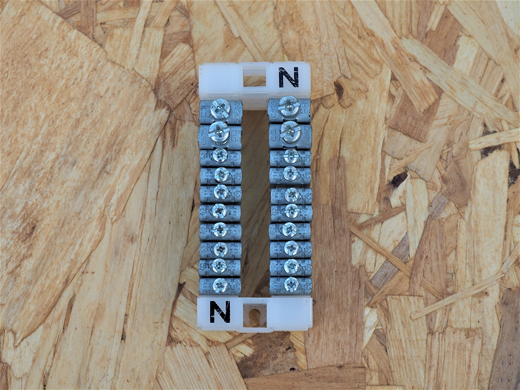 Such terminal blocks are used for connecting two wires. They are called single-feed terminal blocks and feature only one output contact and one input.